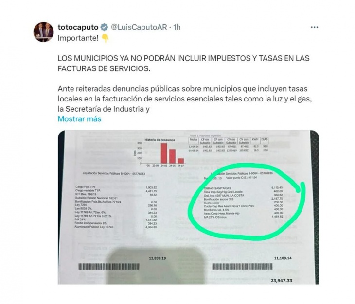 El gobierno nacional anunció que provincias y municipios ya no podrán incluir en las boletas de los servicios públicos tasas y recargos a través de una medida que se conocerá en el Boletín Oficial este miércoles, según anticipó el ministro de Economía Luis Caputo. El Poder Ejecutivo sostiene así su pelea contra los reajustes impositivos a nivel municipal que la semana pasada había denunciado en supermercados.