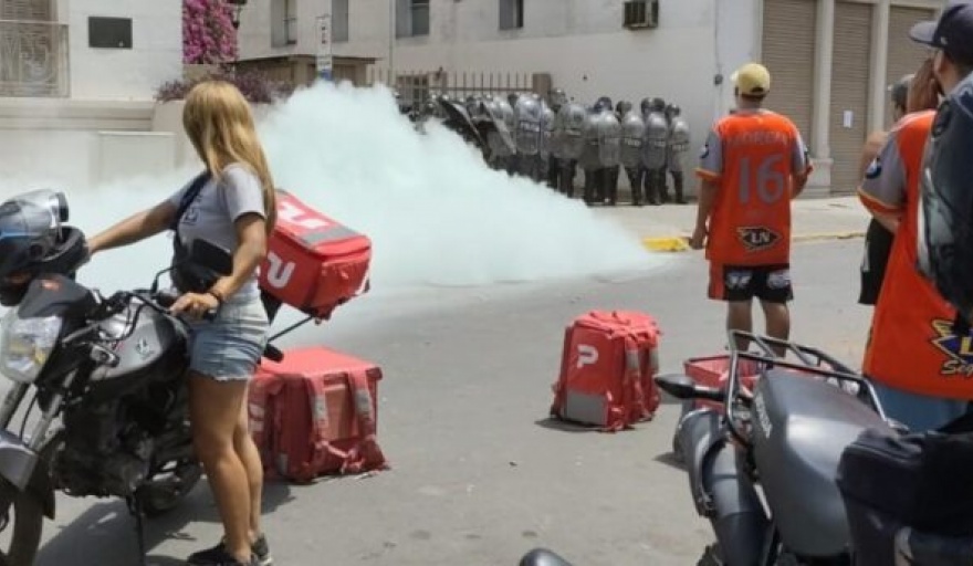 Los compañeros del repartidor asesinado querían acercarse a la intendencia pero los efectivos les arrojaron gas pimienta mientras trataban de apagar el fuego.