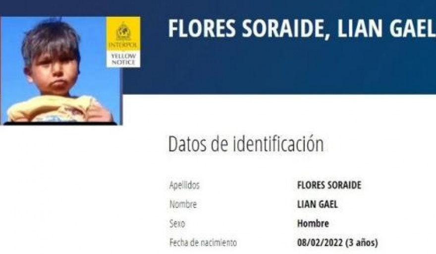 La Organización Internacional de Policía Criminal (Interpol) emitió este martes una alerta amarilla en el marco de la búsqueda de Lian Gael Flores Soraide, el nene de 3 años que desapareció en la provincia de Córdoba, ante la posibilidad de que el menor haya salido de la Argentina.