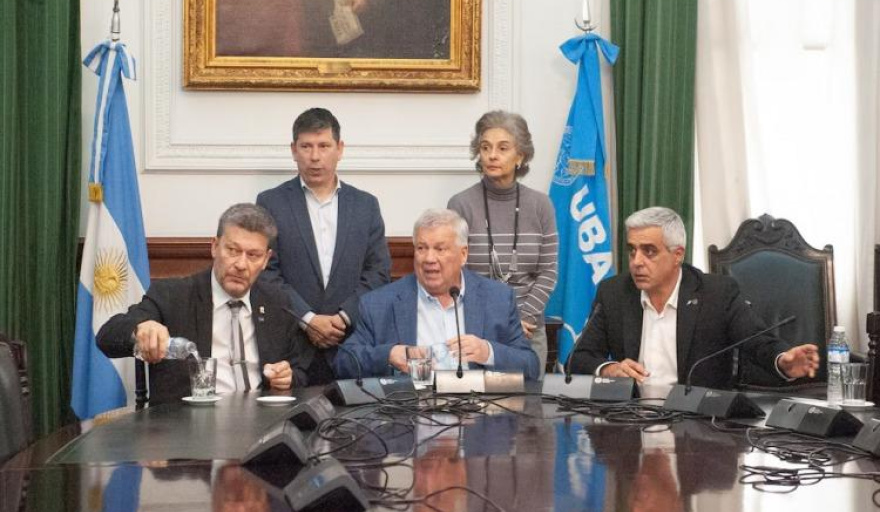 El rector de la UBA, Ricardo Gelpi, el presidente del CIN, Oscar Alpa, y el vicerrector del CIN, Franco Bartolacci, encabezaron una conferencia de prensa en el Consejo Superior del Rectorado, donde brindaron un diagnóstico sobre la situación de la institución.