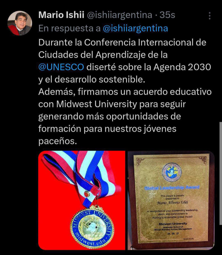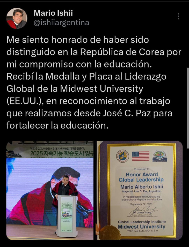 El diploma otorgado expresa: “Presentado a Mario Alberto Ishii, Alcalde de José C. Paz, en reconocimiento de su excelente liderazgo y contribuciones globales”, firmado por el Dr. James Song, Presidente del Instituto de Liderazgo Global/Foro, Midwest University, Wentzville, Missouri, EE. UU., el 27 de septiembre de 2025.