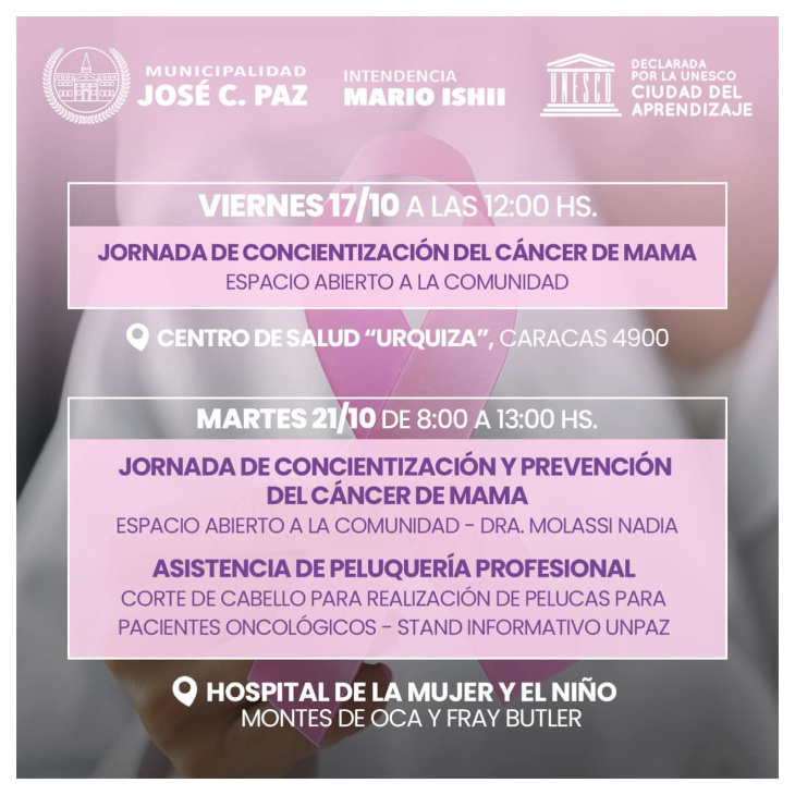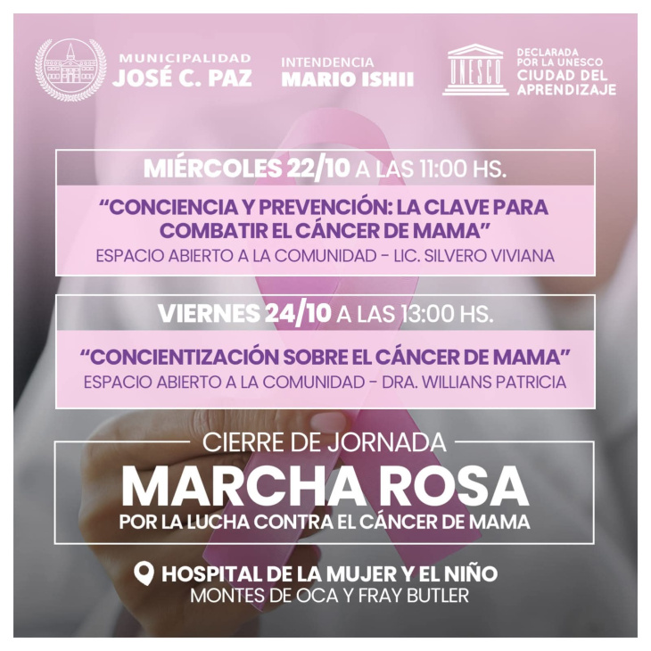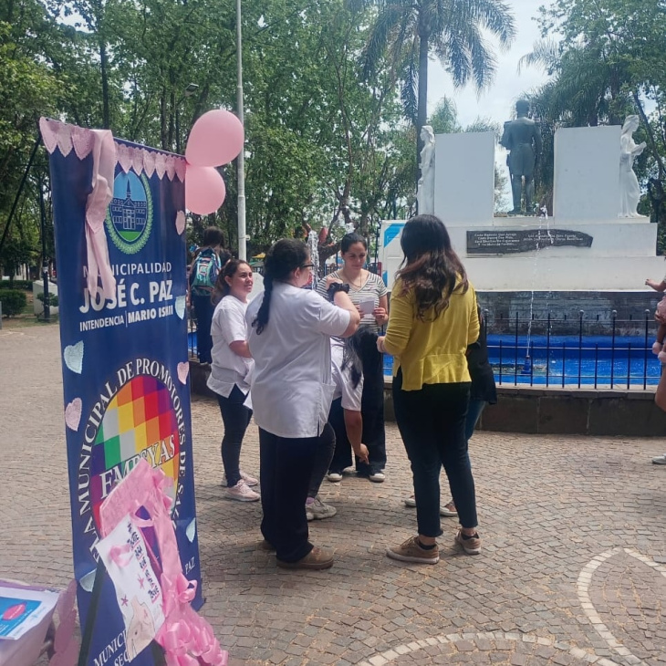 La Secretaría de Salud municipal de José C Paz desarrolló en la plaza Manuel Belgrano una jornada de prevención y concientizacón sobre el cáncer de mama donde se difundieron las distintas actividades que se van a desarrollar en el distrito con relación a la concientización