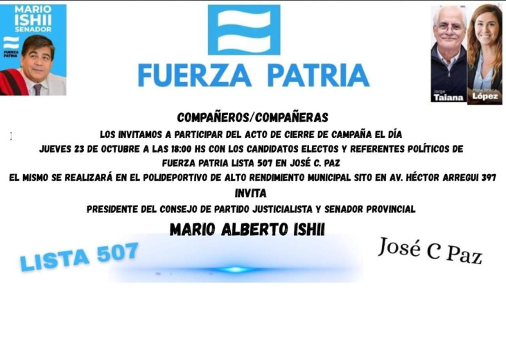Del acto de Cierre de Campaña participarán los candidatos electos y referentes políticos de Fuerza Patria, de José C Paz .