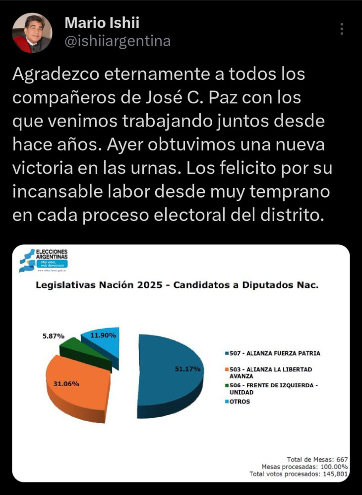 Los resultados de la elecciones del 26 de octubre en José C Paz continúan marcando el ritmo del electo Senador provincial Mario Alberto Ishii quien acumula 44 elecciones victoriosas .