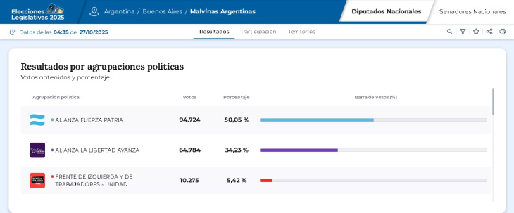 En Malvinas Argentinas, con el 98,65% de las mesas escrutadas, la lista Fuerza Patria obtuvo el 50,5% de los votos, mientras que La Libertad Avanza alcanzó el 34,23%.