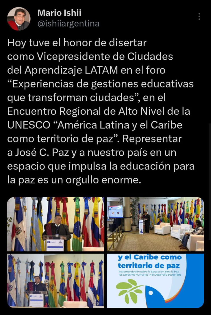 El Intendente Municipal de José C. Paz y como Vicepresidente de Ciudades del Aprendizaje LATAM, Dr. HC Mario Alberto Ishii participó en Santo Domingo, República Dominicana, del Encuentro Regional de Alto Nivel de la UNESCO "América Latina y el Caribe como territorio de Paz", representando a Argentina y a las Ciudades del Aprendizaje de la región.
