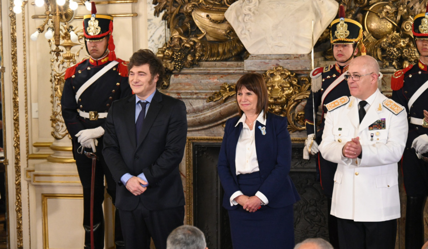 El presidente Javier Milei encabezó el acto de ascenso de las Fuerzas de Seguridad junto a la ministra de Seguridad, Patricia Bullrich, en una breve ceremonia que se llevó adelante en el Salón Blanco de Casa Rosada. Se trata de la asunción de oficiales superiores de la Prefectura Naval Argentina, de la Policía Federal, de la Gendarmería Nacional, de la Policía de Seguridad Aeroportuaria y del Servicio Penitenciario Federal.