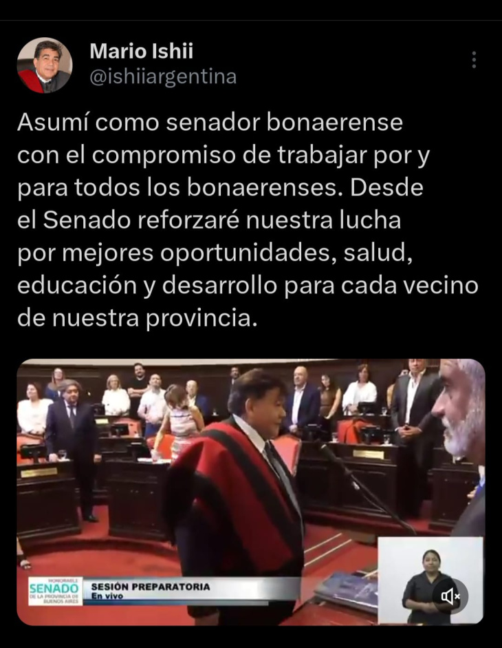 El ahora ex intendente de José C Paz Mario Ishii asumió, en el recinto de la Legislatura Bonaerense, su banca de Senador Provincial luego de prestar juramento de rigor ante la Presidenta de la Cámara.”Juro por mi familia y por la lealtad a los bonaerenses” fueron las palabras de Mario Ishii.