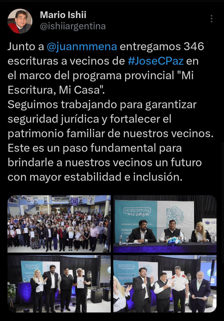 “Hoy estamos cumpliendo el sueño de 346 familias que esperaron durante años por este momento. La escritura de la casa propia no es solo un papel, es la tranquilidad de saber que nadie les va a sacar lo que tanto les costó construir”, expresó emocionado el Senador Ishii ante los vecinos presentes. Y agregó: “Seguiremos trabajando incansablemente para que cada familia de José C. Paz tenga la seguridad jurídica que se merece, porque esa es nuestra responsabilidad y nuestro compromiso".