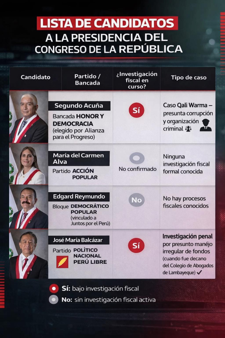 . La opción será entre los legisladores derechistas María del Carmen Alva (Acción Popular) y Héctor Acuña (APP), y los izquierdistas Edgar Reymundo (Bloque Democrático Popular) y José Balcázar (Perú Libre, el partido del ex presidente Pedro Castillo).
