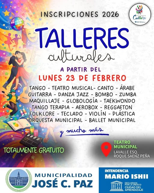 El lúnes 23 de febrero comienzan las inscripciones a los talleres culturales gratuitos de la Dirección de Cultura. Las mismas son de manera presencial en el Teatro Municipal de José C. Paz (EX Cine Paz) ubicado en Lavalle esquina Roque Saenz Peña, en el horario de 9 a 17 hs.