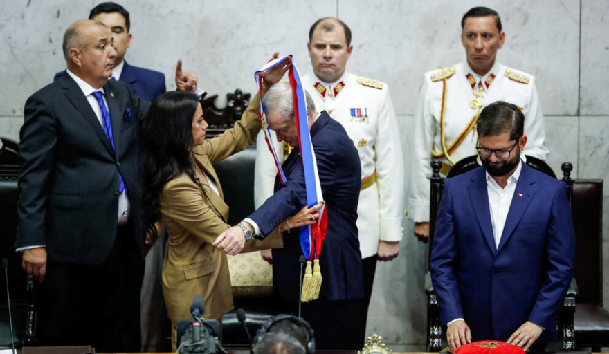 La ceremonia de investidura en el Congreso Nacional de Valparaíso tuvo sus propias señales políticas. Quien le entregó la banda presidencial fue la nueva presidenta del Senado, Paulina Núñez, de Renovación Nacional. Al otro lado de la testera, el presidente saliente Gabriel Boric entregó a su sucesor una carta cuyo contenido no fue revelado. Entre los invitados internacionales destacó la presencia de Flávio Bolsonaro, senador e hijo del expresidente brasileño Jair Bolsonaro; y el abrazo entre Kast y el presidente argentino Javier Milei fue uno de los momentos más fotografiados de la jornada.