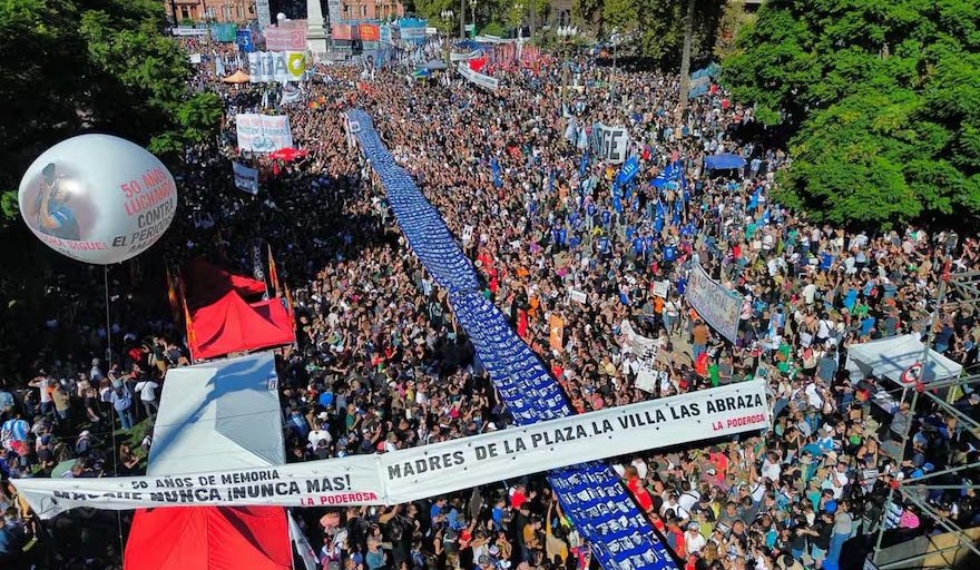 La marcha por el Día de la Memoria, la Verdad y la Justicia de este 24 de marzo reunió a cientos de miles de personas en Plaza de Mayo y en distintos puntos del país, en una convocatoria que diversas organizaciones coincidieron en calificar como una de las más masivas de las últimas décadas. La conmemoración, atravesada por el 50° aniversario del golpe de Estado de 1976, combinó una fuerte carga histórica con consignas actuales frente al contexto político.