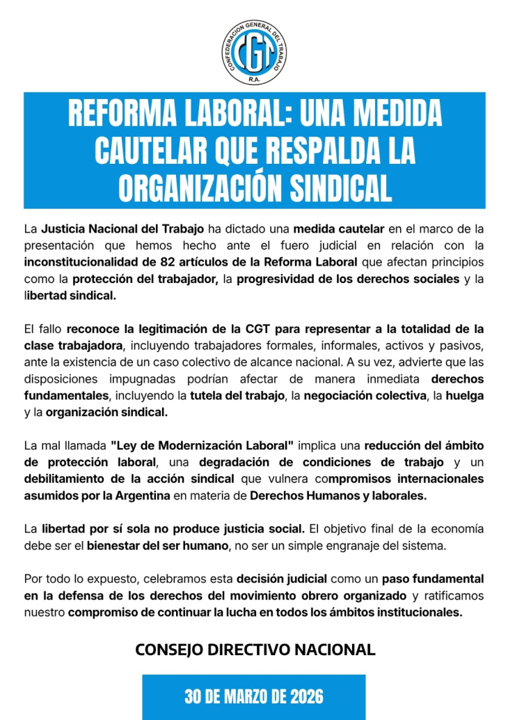 El fallo representa un triunfo contundente para la CGT, que logra así la primera suspensión de alcance general contra la reforma laboral. Hasta ahora, las resoluciones judiciales habían sido parciales o centradas en aspectos específicos, sin poner en jaque el núcleo de la ley como ocurre en esta oportunidad.