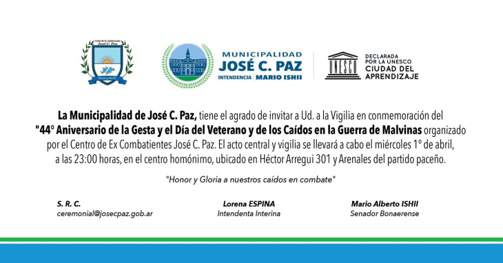 José C Paz homenajea de este modo a sus Veteranos de Guerra, Héroes contemporáneos, y recuerda a quienes ofrendaron hace 44 años la vida por la Patria, comprometiendo a todos los argentinos a persistir en el reclamo de nuestros derechos soberanos sobre las islas Malvinas.