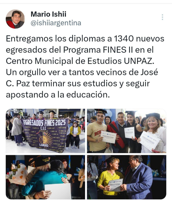 El Senador bonaerense e Intendente Municipal en uso de licencia, Dr. HC Mario Ishii, presidió la entrega de diplomas correspondiente al ciclo lectivo 2025 del Programa FINES II, en el Centro Municipal de Estudios (CEM UNPAZ), ubicado en Alem 4593, José C. Paz.